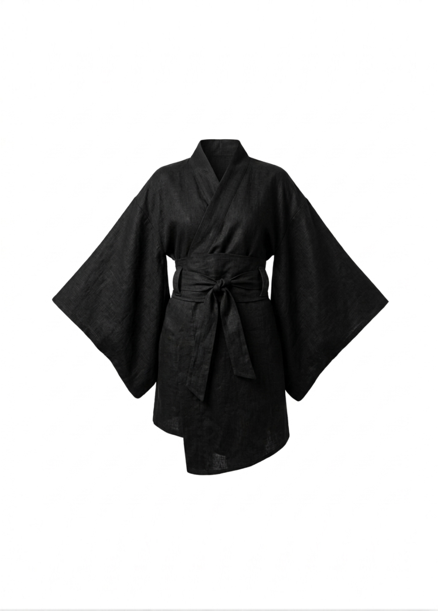Кимоно с асимметричным кроем подола и глубоким запахом, позволяющим регулировать посадку по фигуре. Вшитый пояс акцентирует внимание на талии. Широкие, объемные рукава подчеркивают аутентичность стиля.