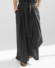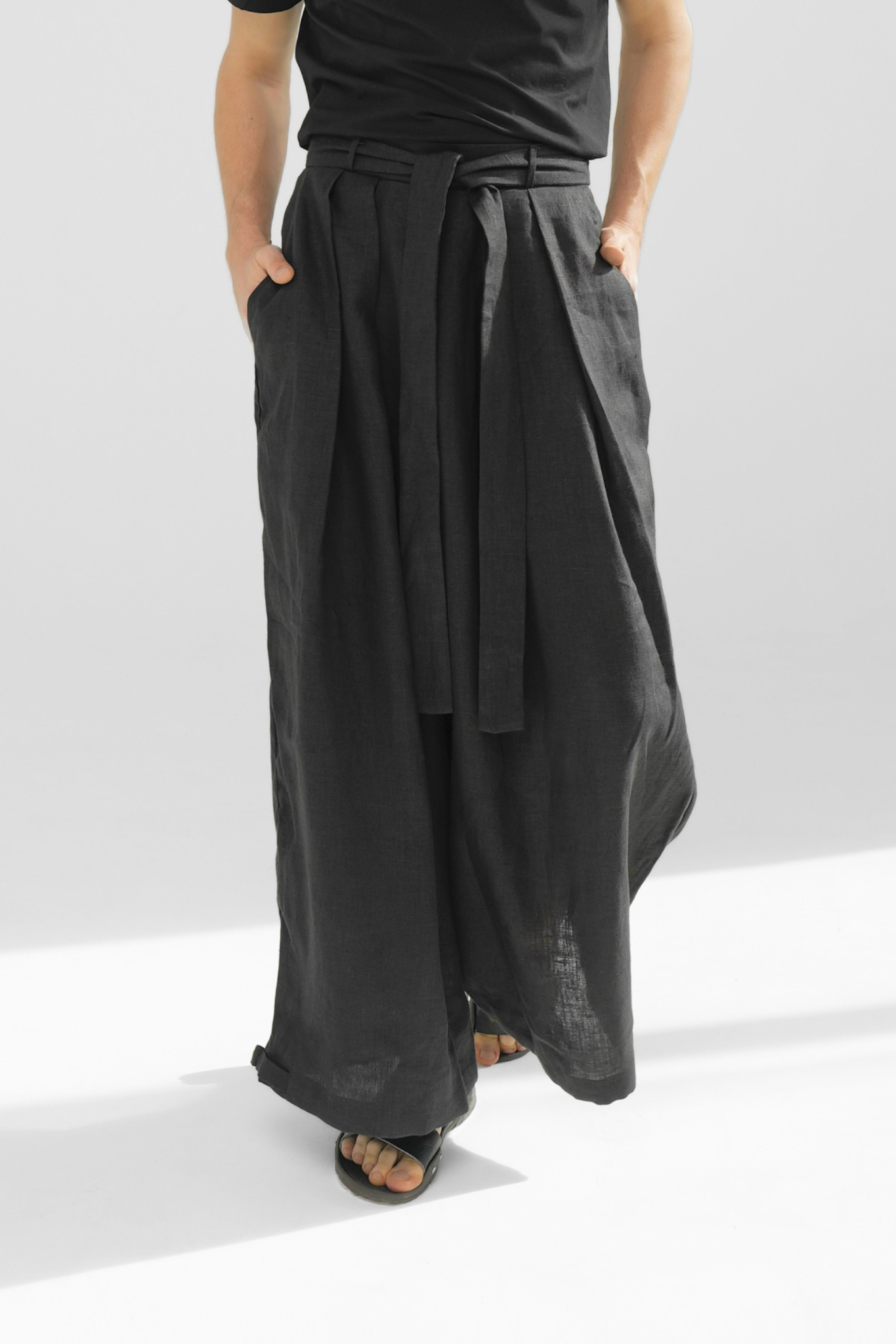Главные особенности этих брюк — скрытая система трансформации и возможность отрегулировать охват пояса под ваш комфорт. Потайные пуговицы позволяют точно отрегулировать посадку, а эластичная резинка и завязки мягко фиксируют объем пояса, не передавливая талию. Благодаря потайной кулиске в нижней части штанин, вы можете менять их силуэт. Носите брюки как классические широкие хакама или затяните кулиску, чтобы создать объемный «баллон» или зауженный к низу силуэт.