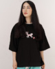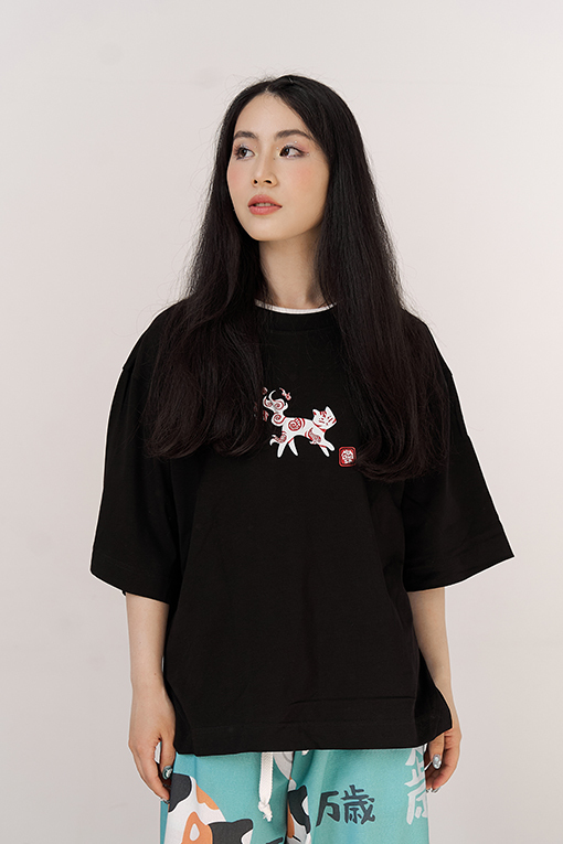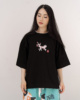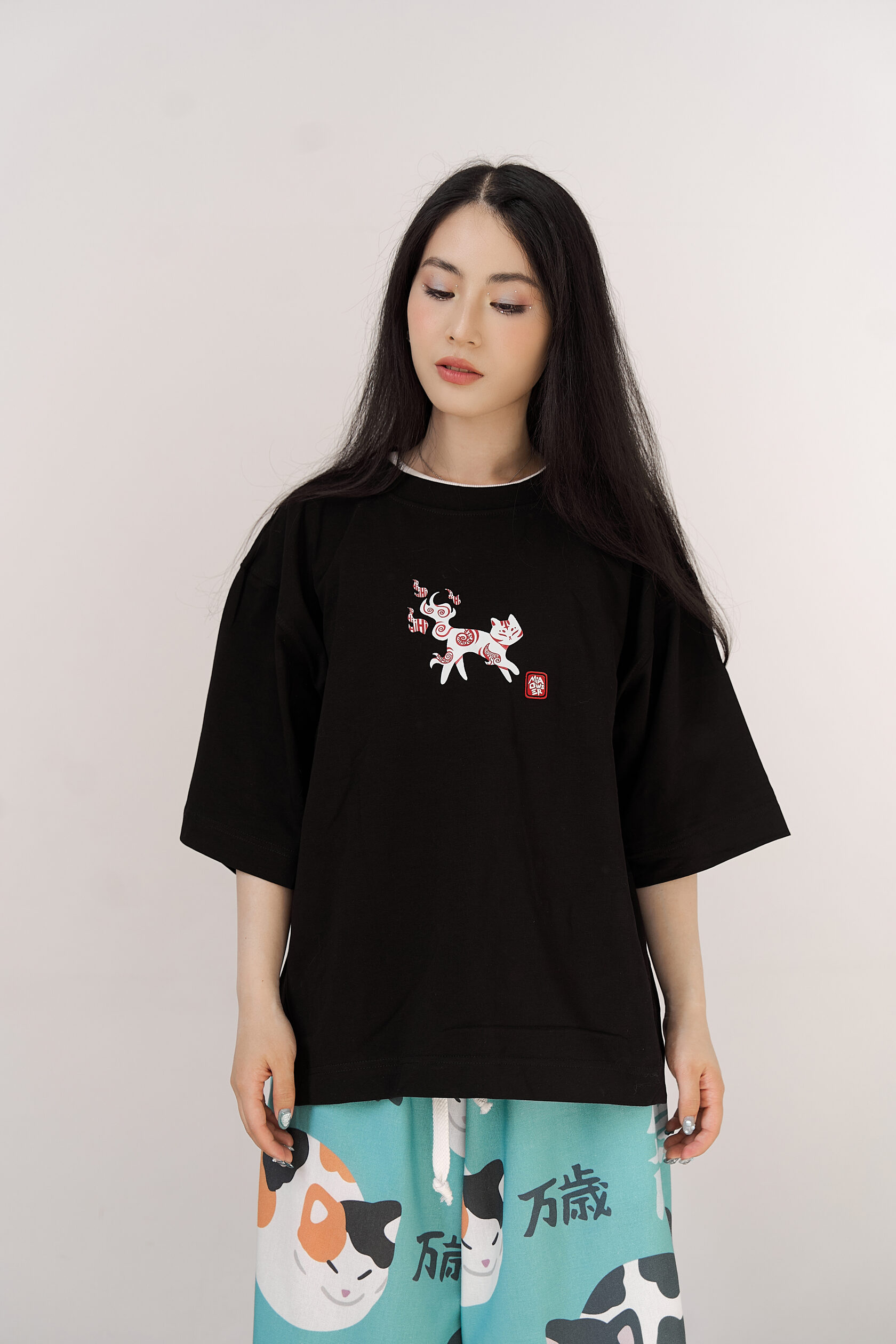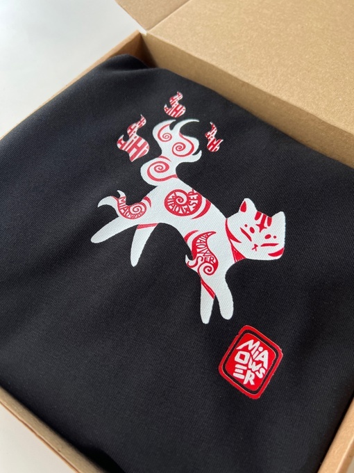 Аматерасу-котизация. Футболка нашего фирменного ассиметричного кроя с огненным котиком. (Надпись на огне: Хи — с японского огонь)