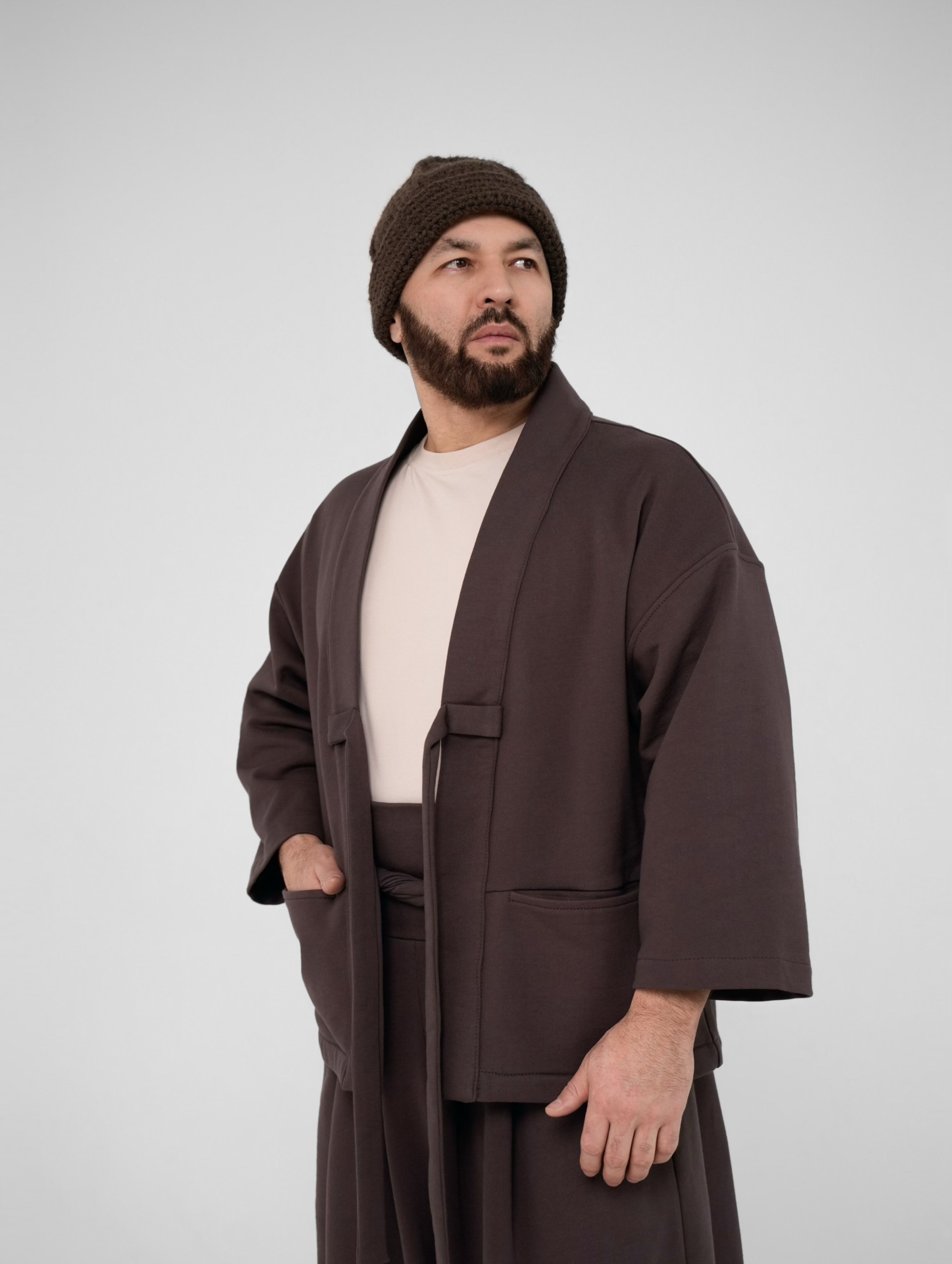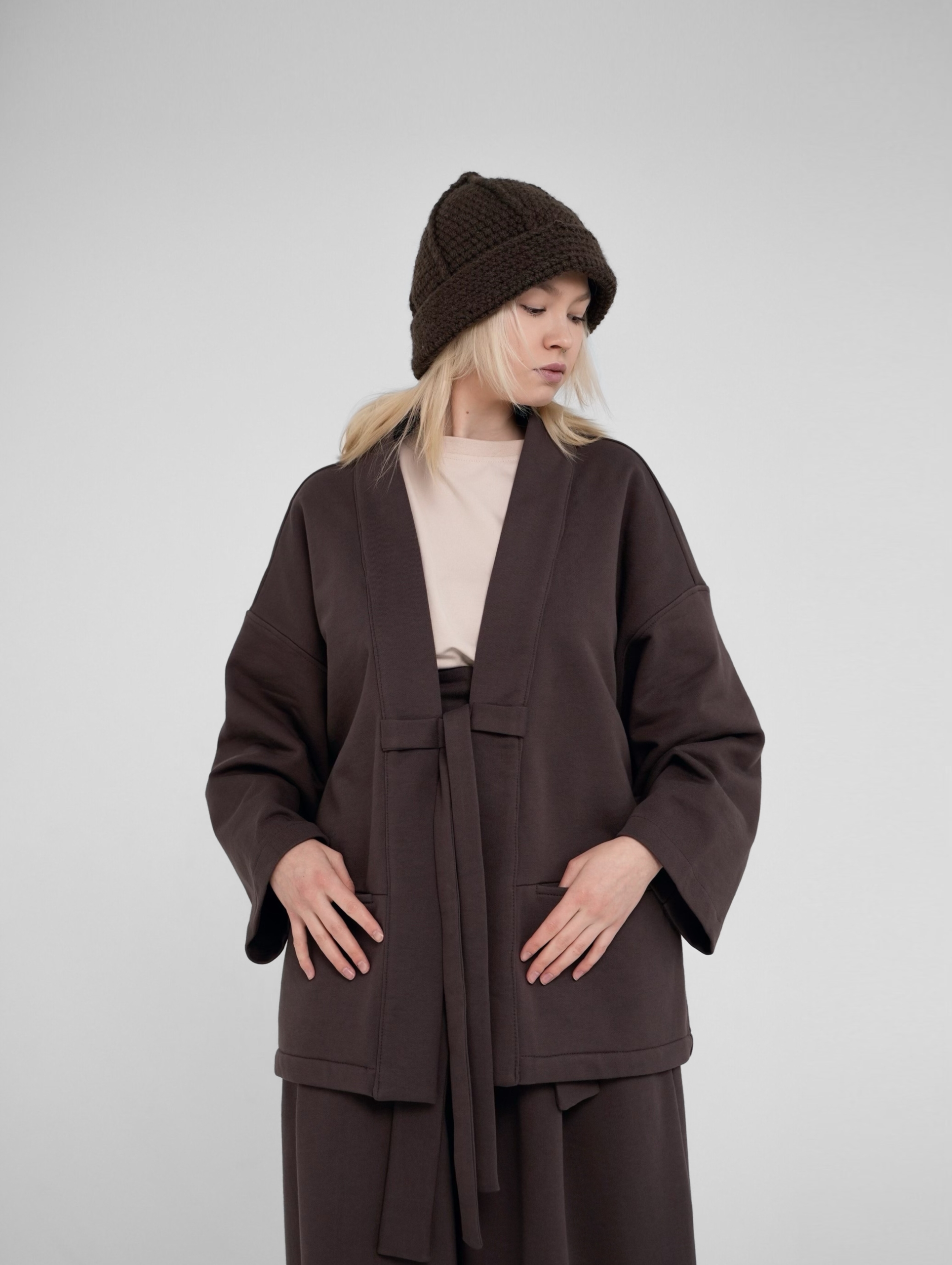 Кардиган выполнен по плотного, компакт пенье футера. Имеет вместительные боковые карманы и вшитые химо.