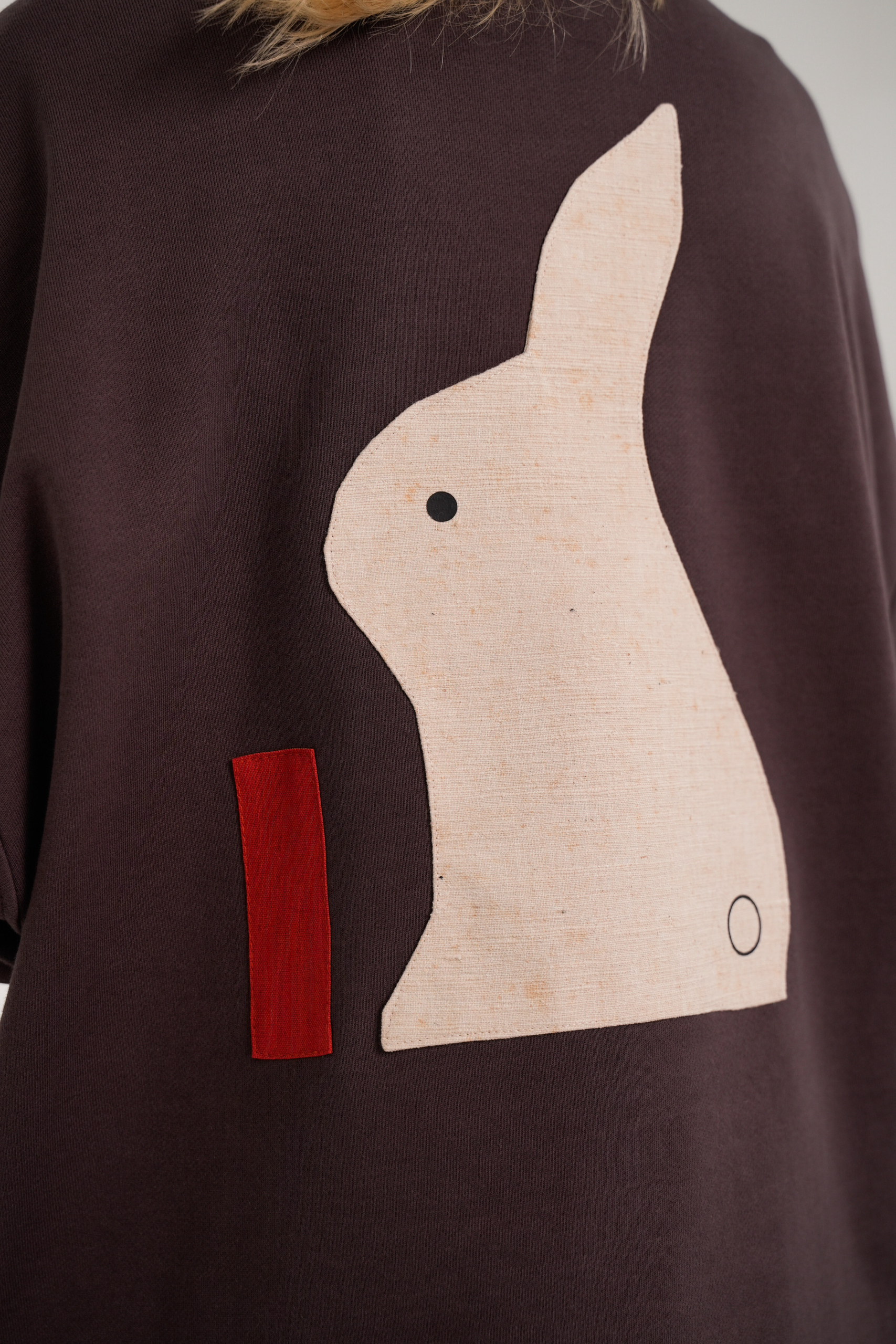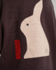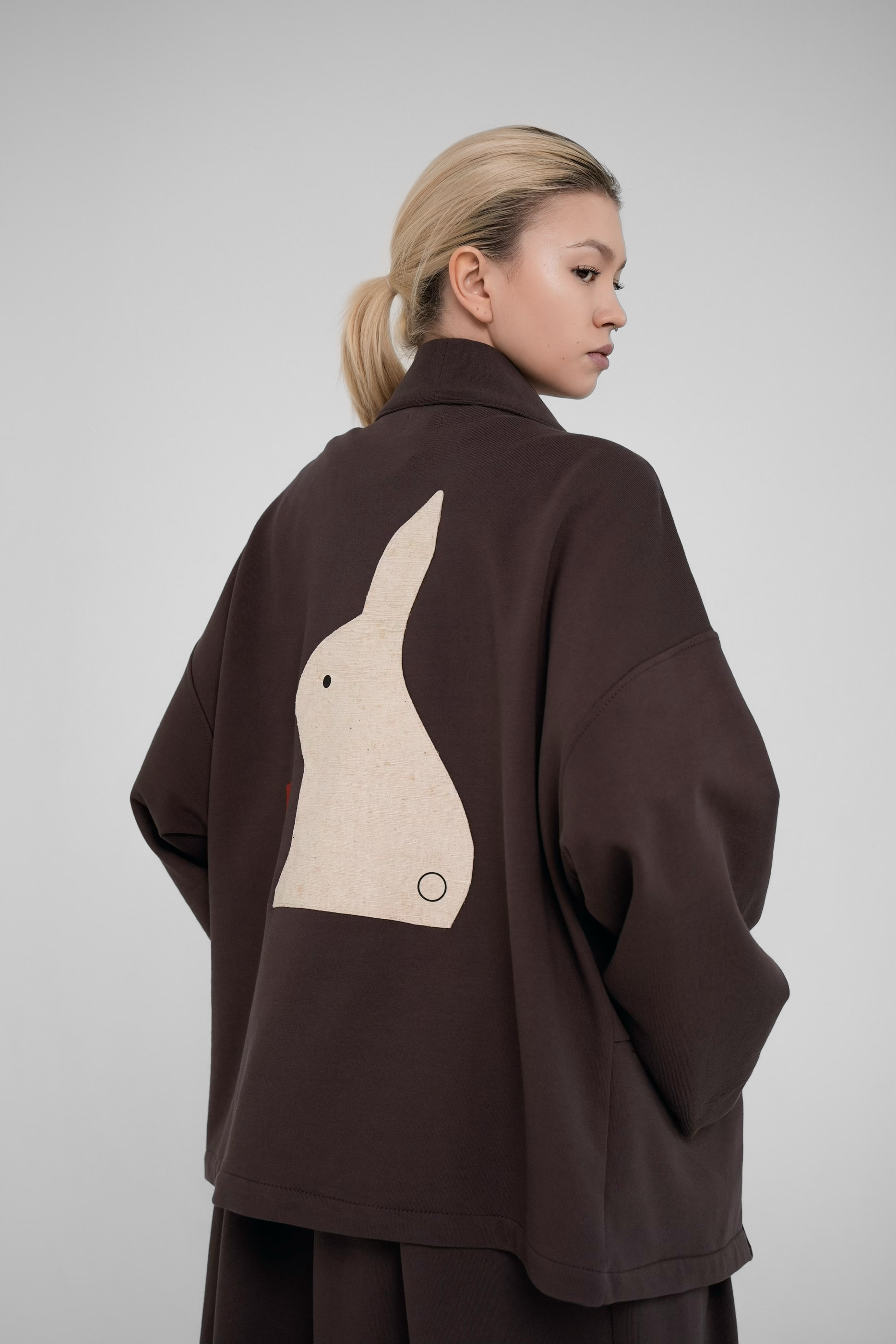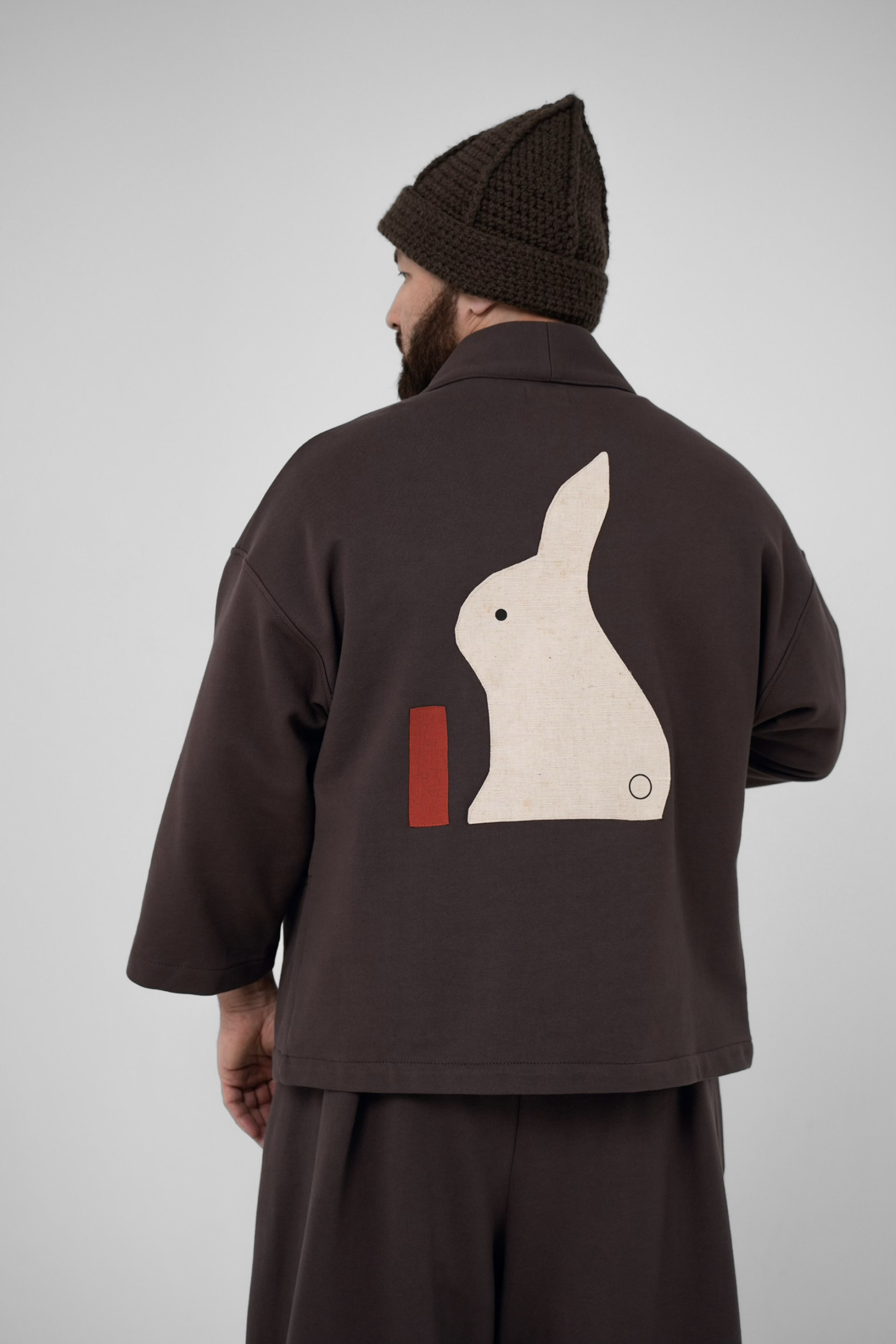 Для создания авторских аппликаций использовалась хлопковая и льняная ткань фурошики, приобретенная в 2025 году основателем бренда в Токио на антикварном маркете Оэдо специально для линейки одежды Kachou Fuugetsu. Её особенность — рельефная и фактурная поверхность, максимальная износостойкость. Работа Usagi отражает кролика, пресытившегося морковью. Все аппликации выполнены в минималистичном стиле и объединены идеей обретения внутреннего покоя через созерцание красоты природы.