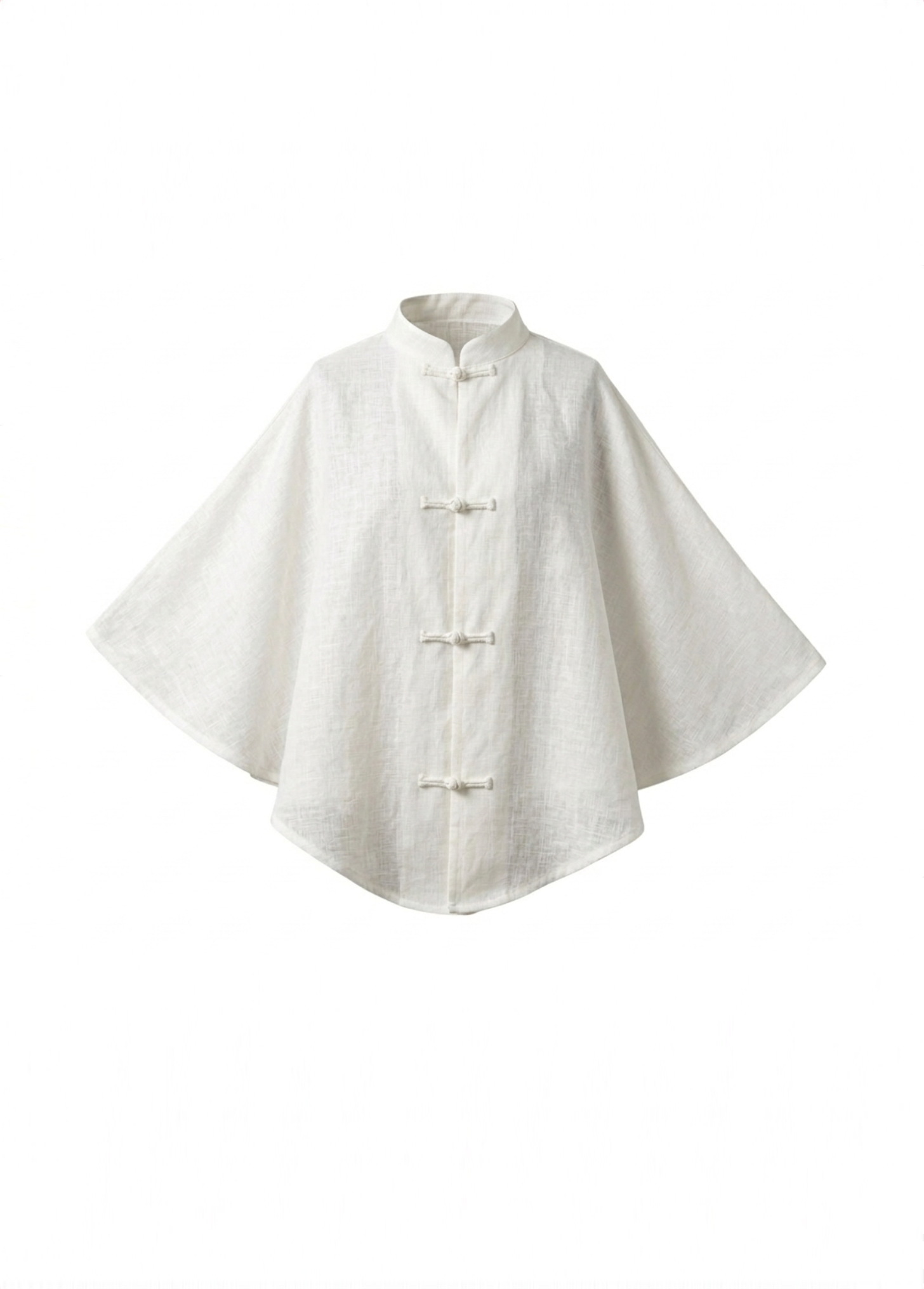 Льняной пончо-кейп с воротником стойкой, узловыми пуговицами pankou и разрезными рукавами. Специальные вертикальные разрезы для рук по центру обеспечивают полную свободу действий. Свободный фасон (Oversize) идеально садится на любую фигуру.