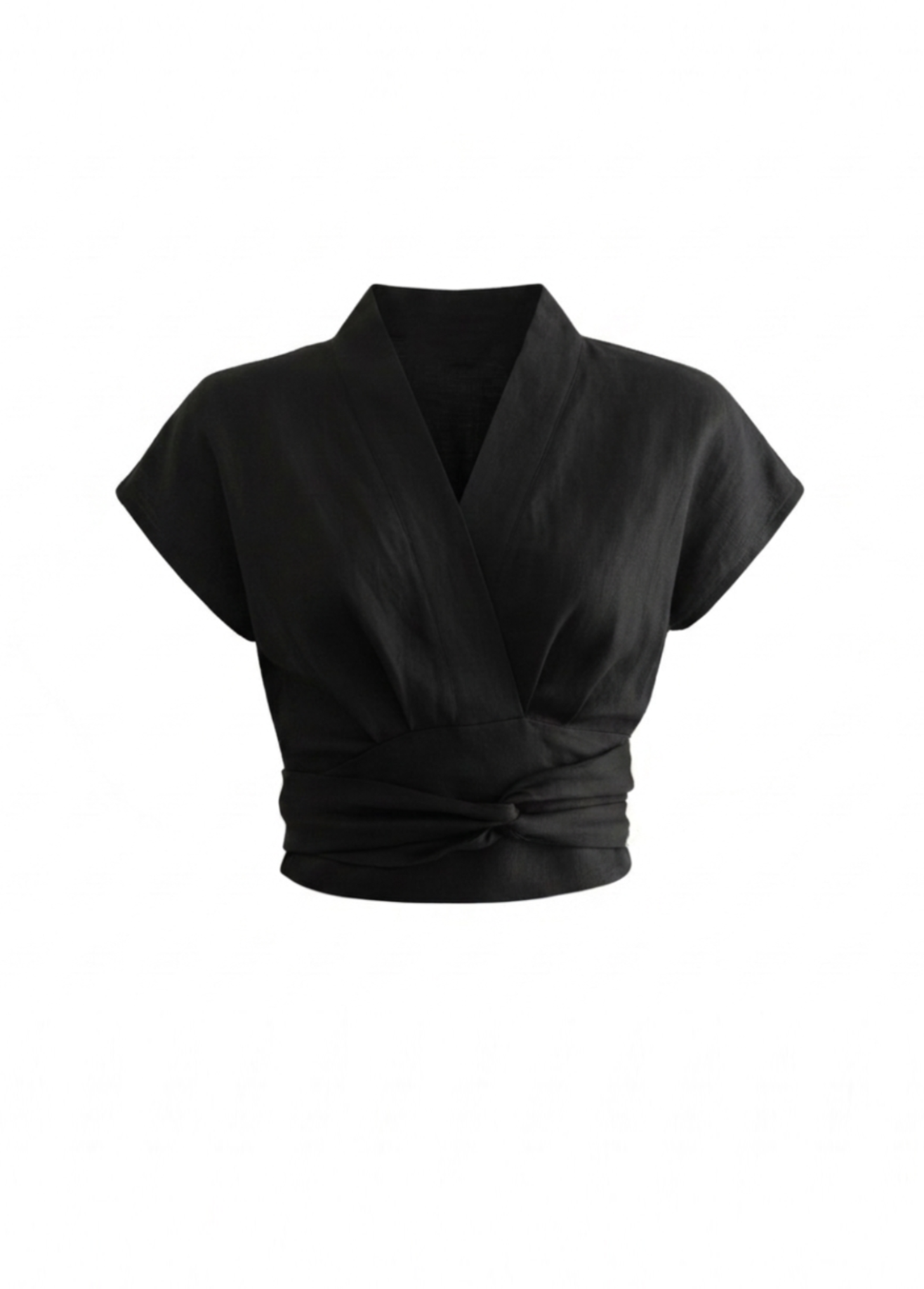 Укороченный силуэт в сочетании с глубоким V-образным вырезом подчеркивает линию шеи и декольте. Конструкция «на запах» позволяет регулировать плотность прилегания, а вшитый пояс надежно фиксирует топ.