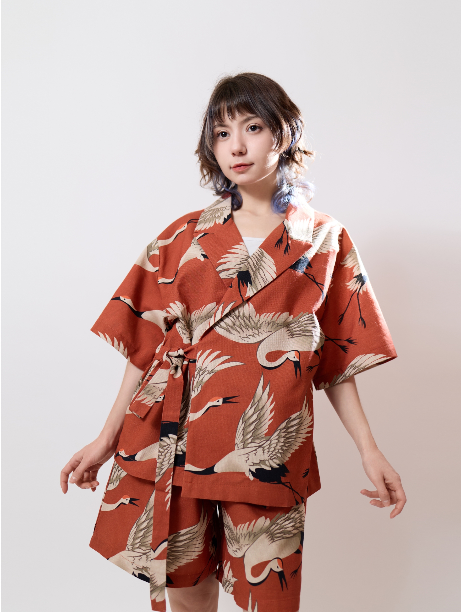 Yoake (夜明け) — четвертый дизайн с летящими журавлями, которые изображены на фоне, напоминающем приятный оттенок алого неба при рассвете. В японской мифологии — это посланники богов, которые приносят благословение и удачу тем, кто их встретит. Разработан дизайн специально для лимитированной коллекции Arashi, 2025. Рисунок выполнен на современном европейском оборудовании, не оставляет следов на белой одежде и не теряет насыщенности после деликатной стирки. Смесь хлопка и льна идеально подойдет для лета. Нити идут вдоль ткани в зигзагообразном порядке, создавая выразительные диагональные узоры и придавая ткани прочность и износостойкость.