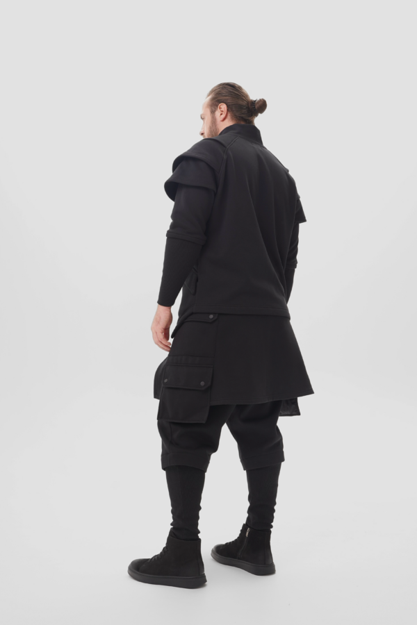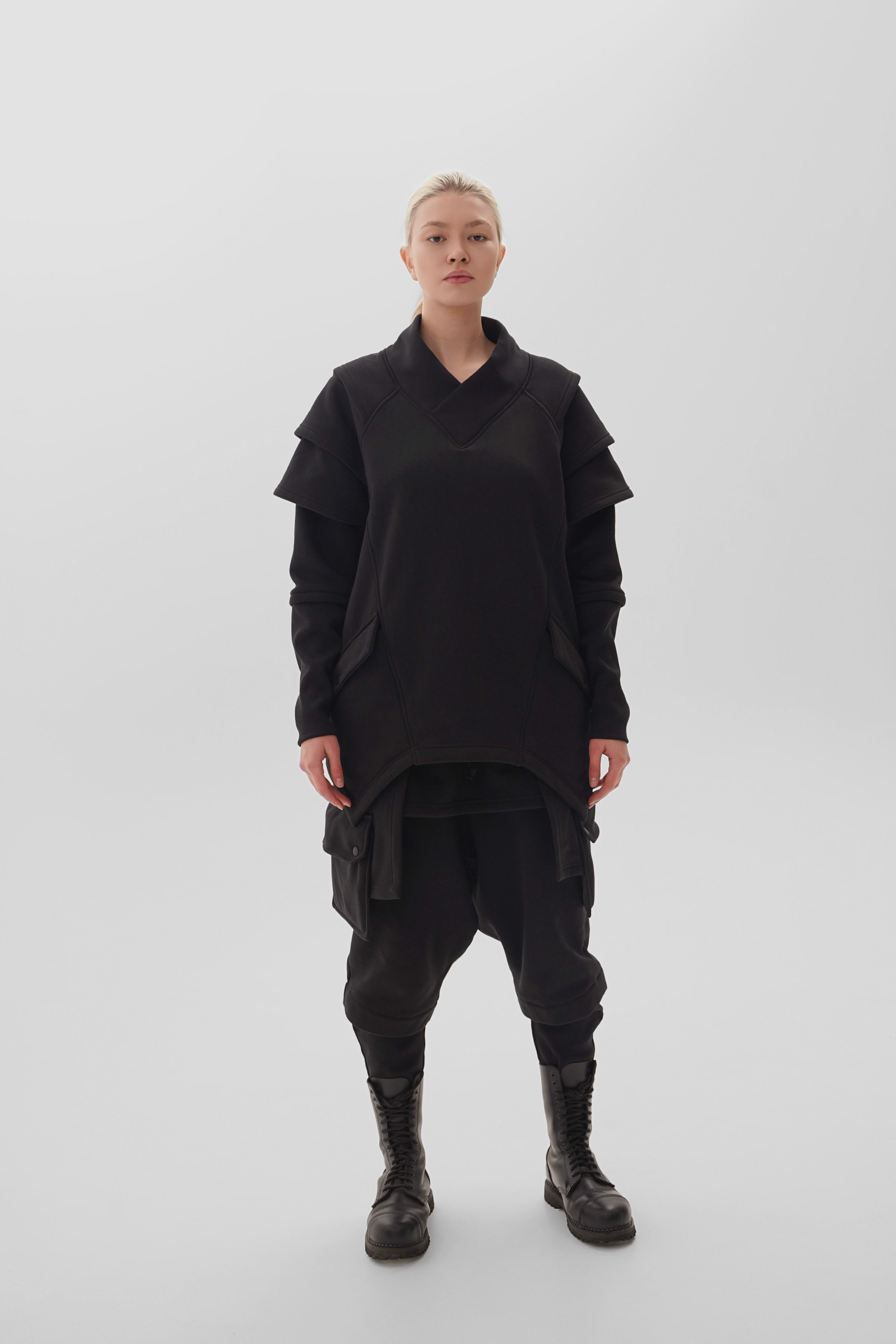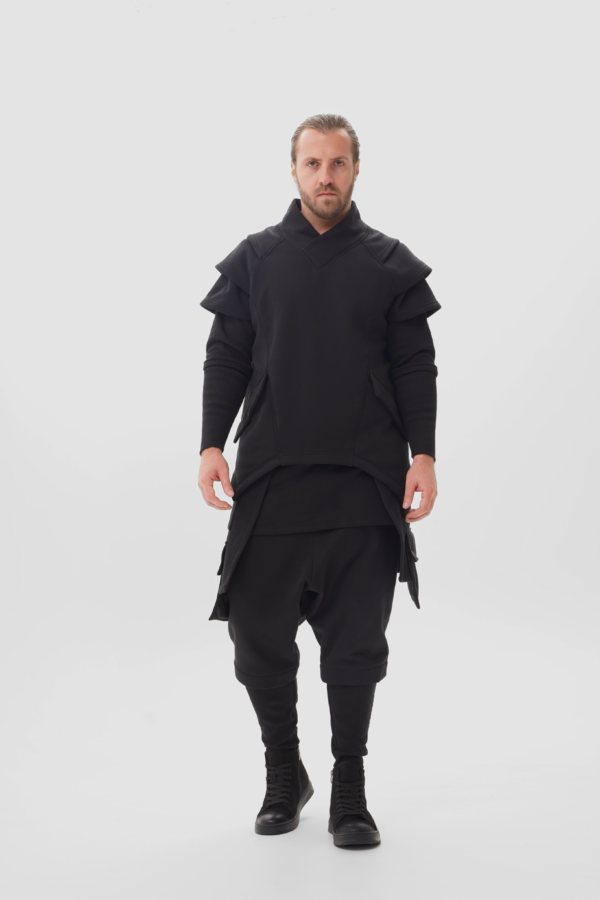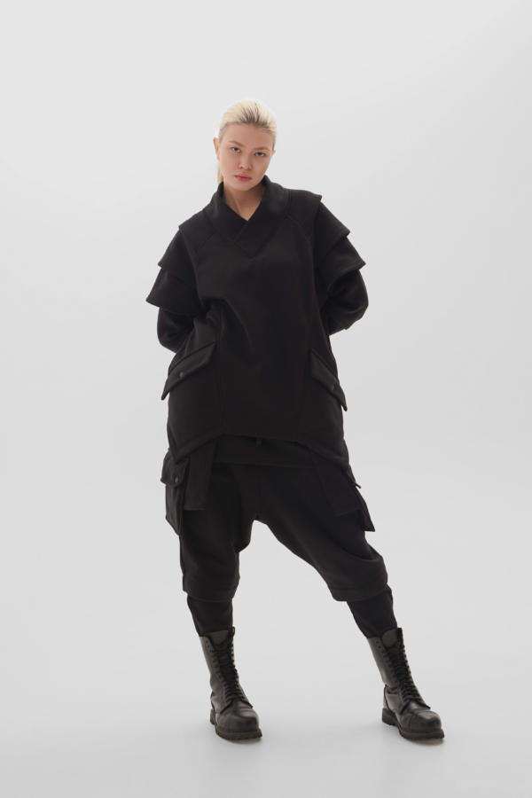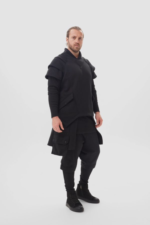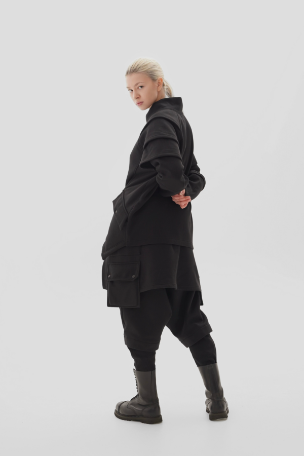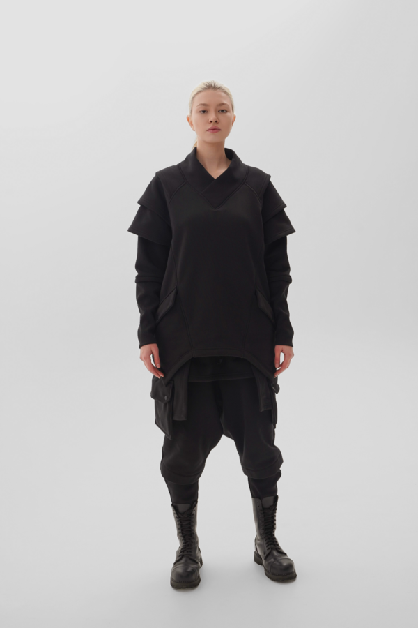 Вдохновлён нагрудным доспехом и латной юбкой-доспехом периода Эдо. Толстовка имеет вместительные боковые карманы, длинные, эластичные манжеты и уникальный крой с широким воротником эри и многослойными плечами.