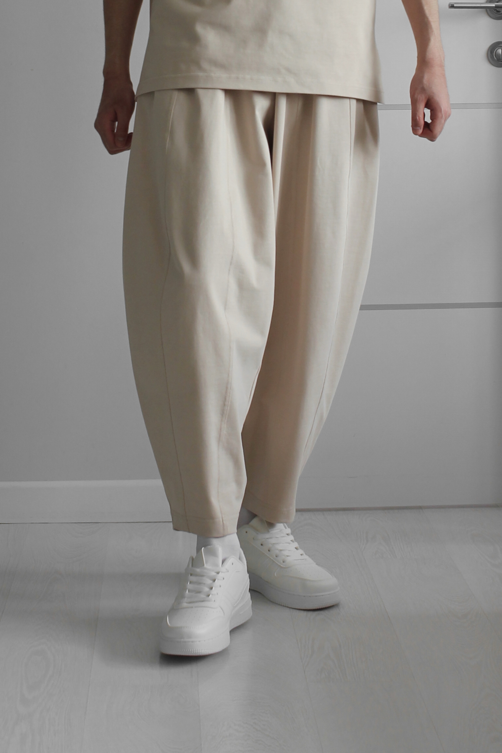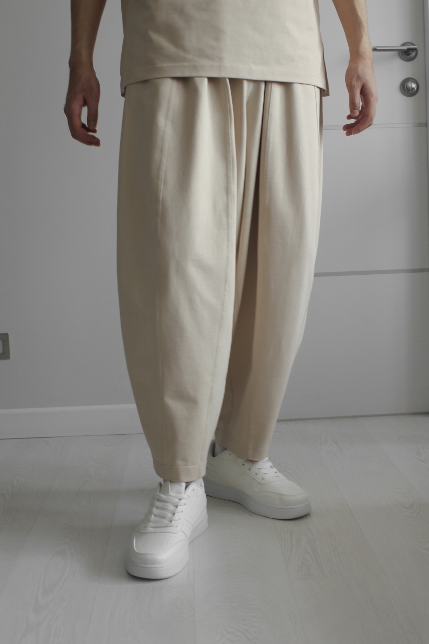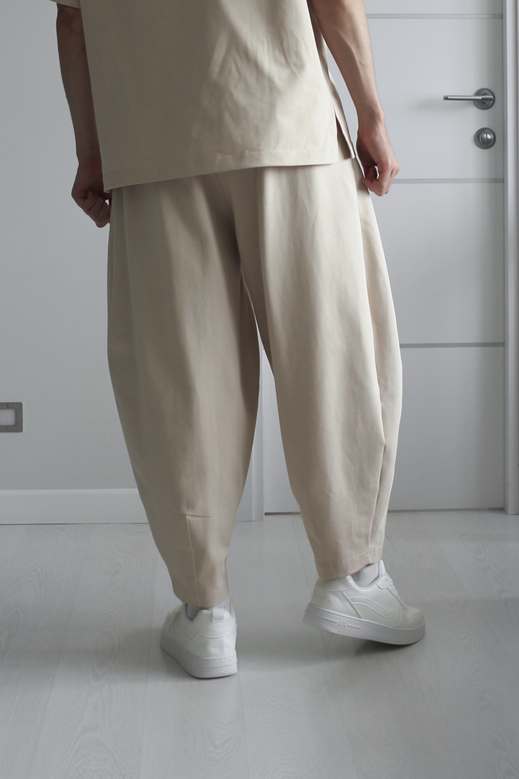 Geto harem pants — лёгкие шаровары свободного кроя, собранные из 10 деталей, сшитых в эстетичный силуэт с выверенными пропорциями и утолщением штанин в области икр.