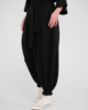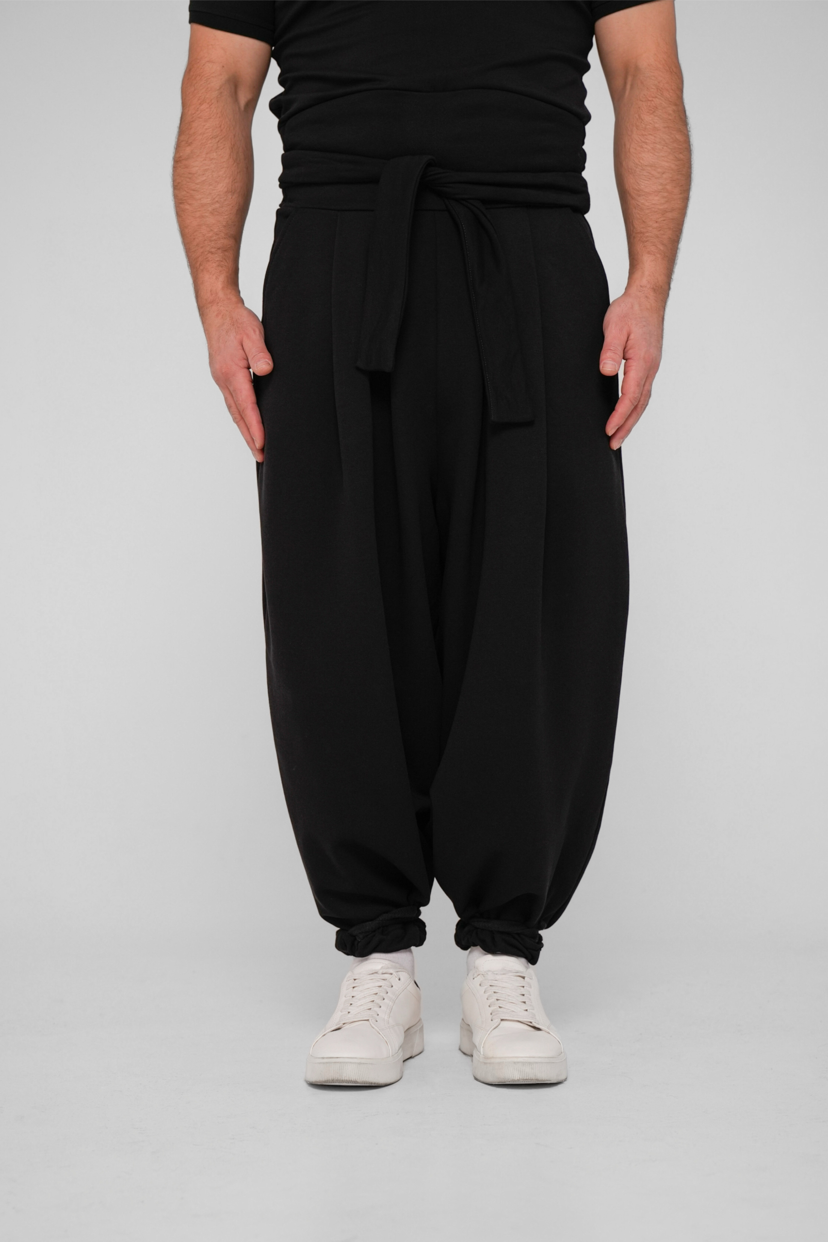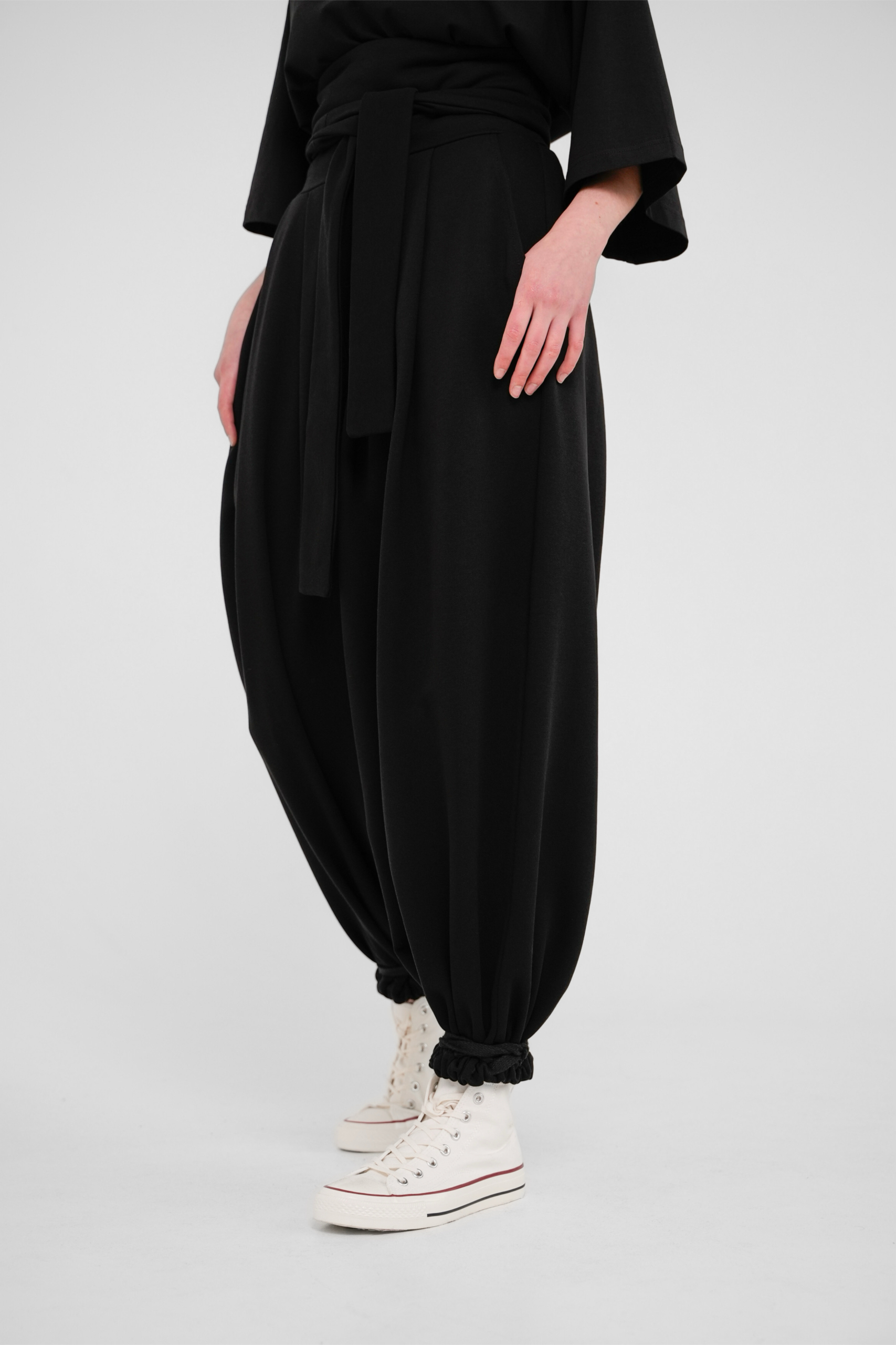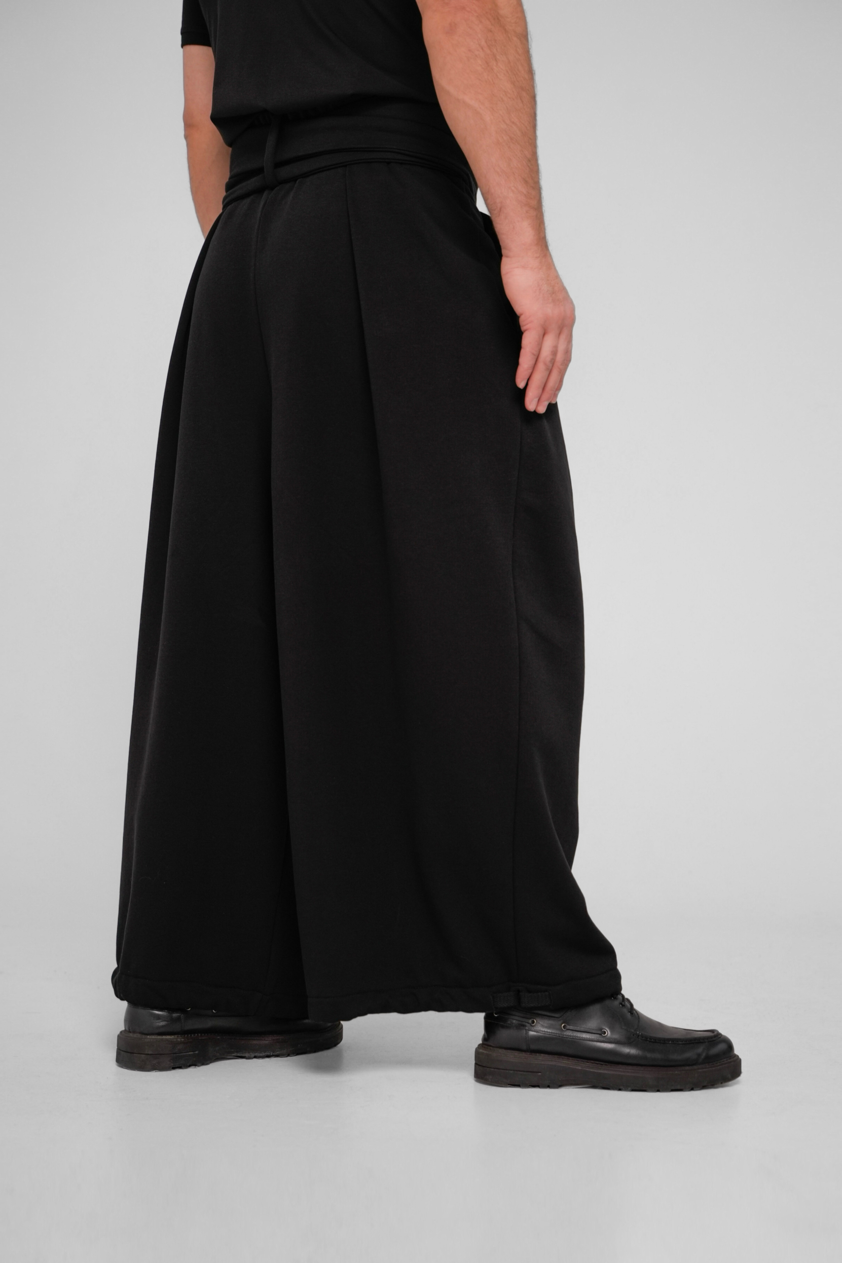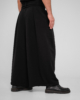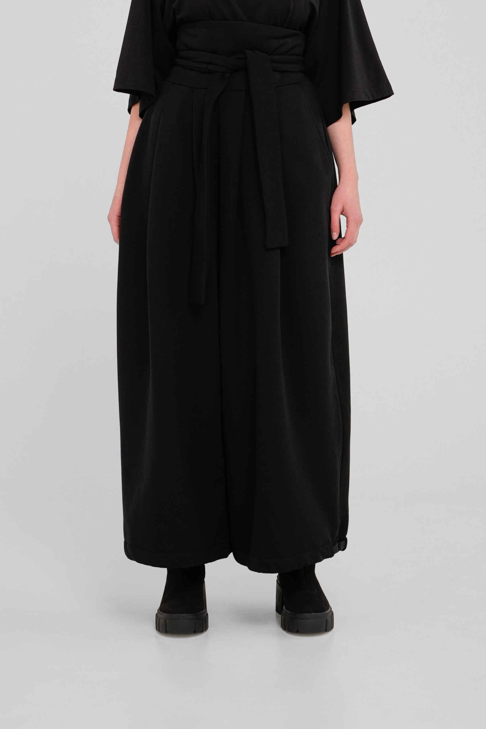 Традиционные японские широкие брюки с измененным кроем выполнены из плотного трикотажа компакт пенье. Удобны и универсальны благодаря возможности регулировать посадку, форму и объем тесьмой в нижней части брюк, а также химо в поясе.