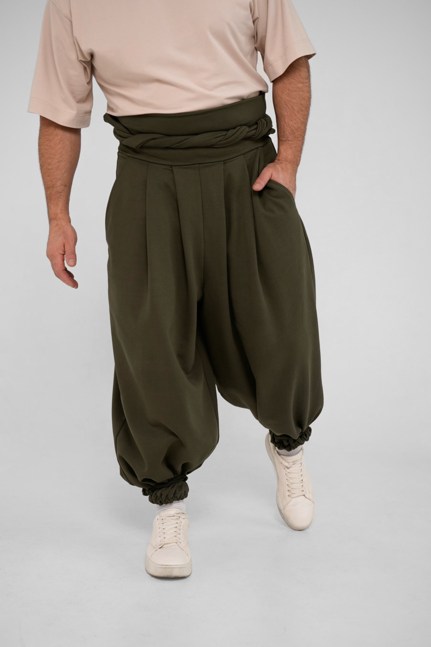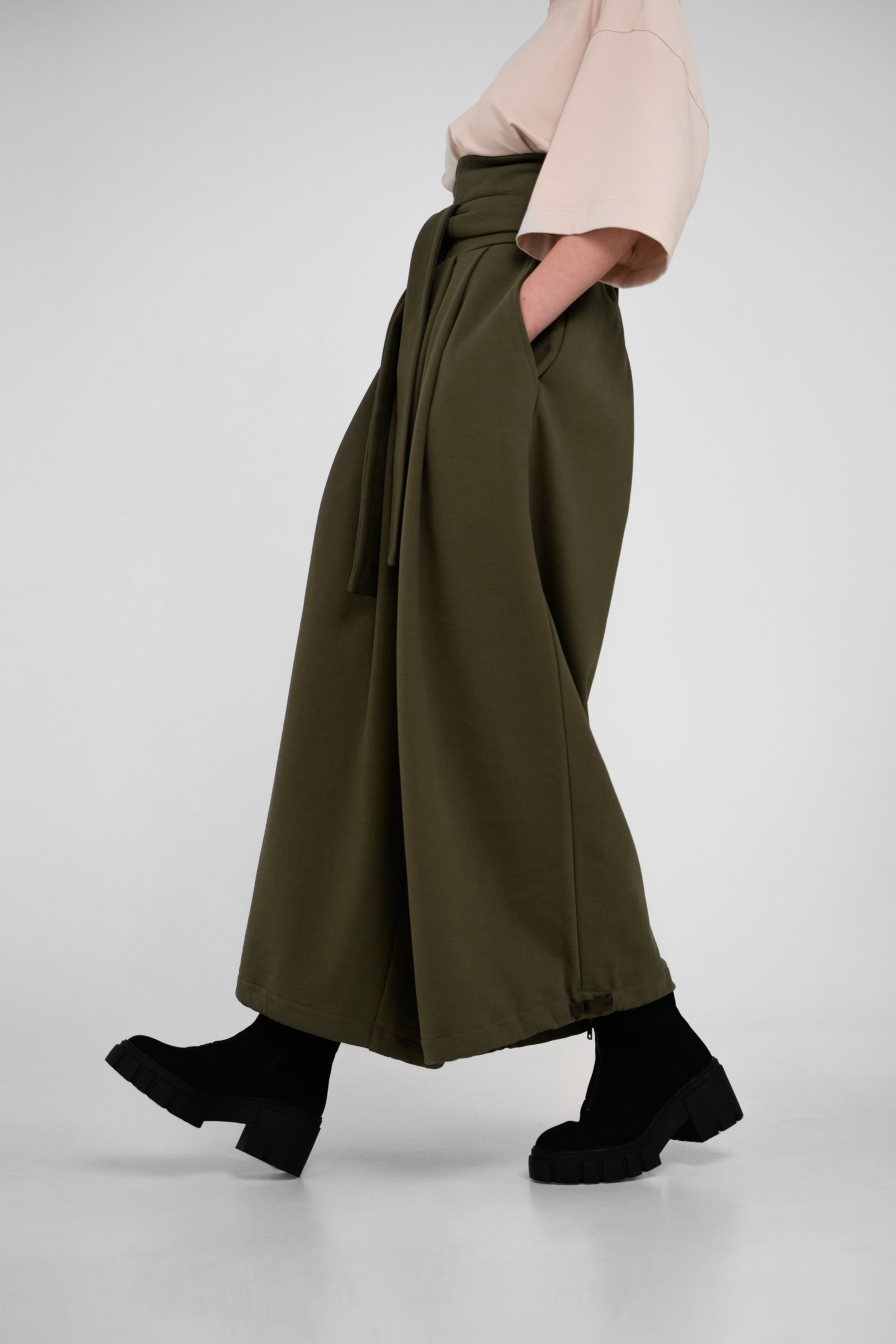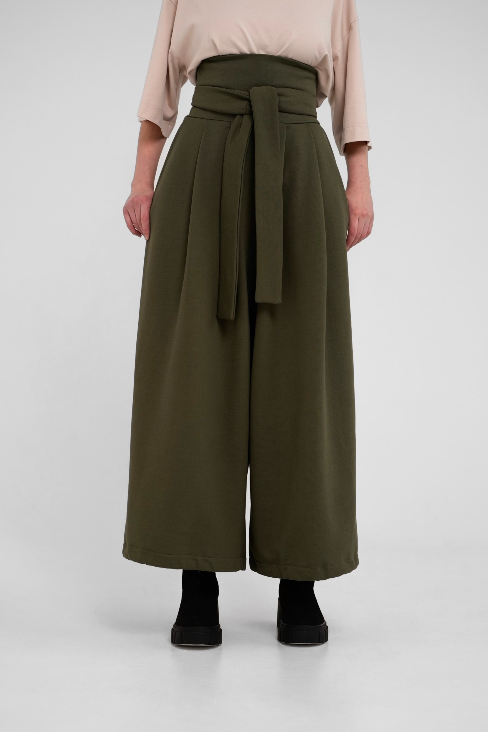 Традиционные японские широкие брюки с измененным кроем выполнены из плотного трикотажа компакт пенье. Удобны и универсальны благодаря возможности регулировать посадку, форму и объем тесьмой в нижней части брюк, а также химо в поясе.