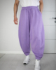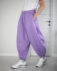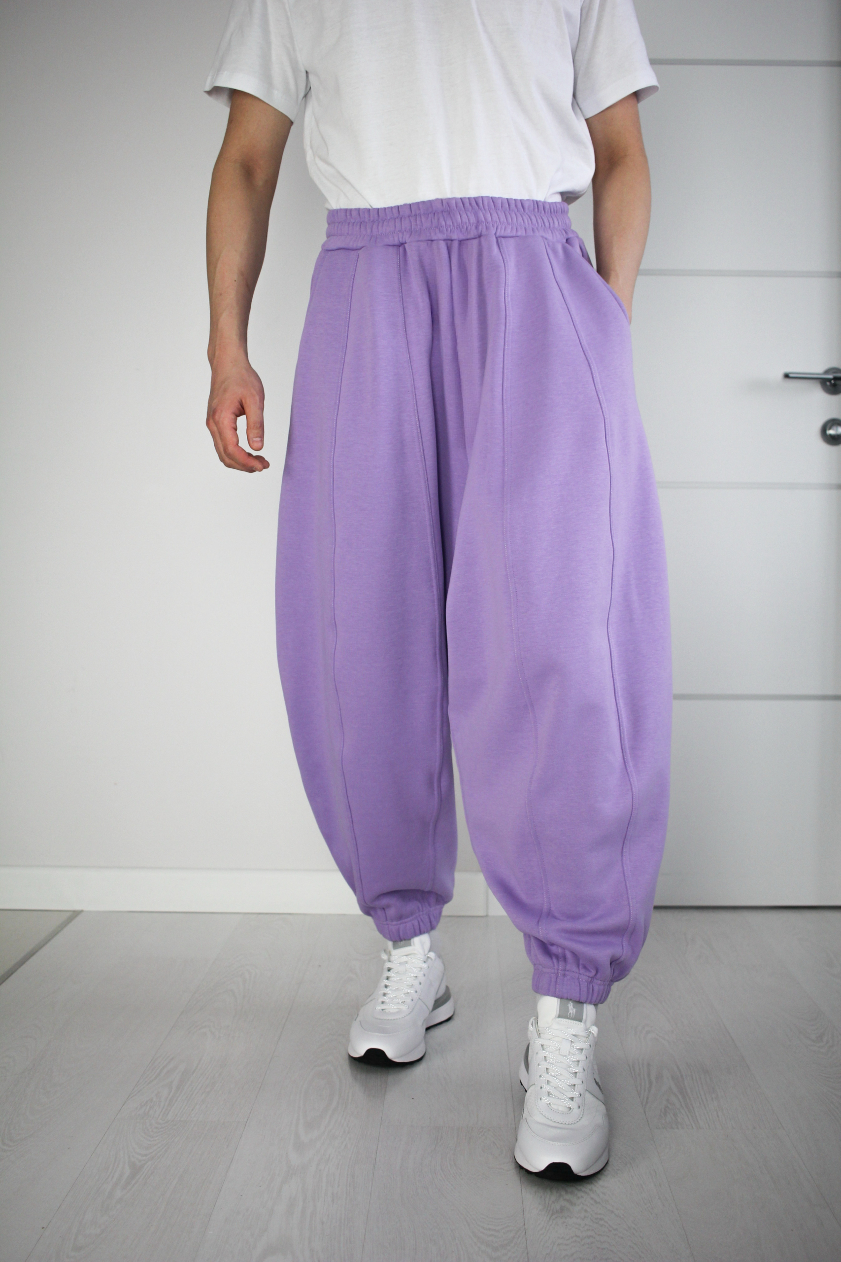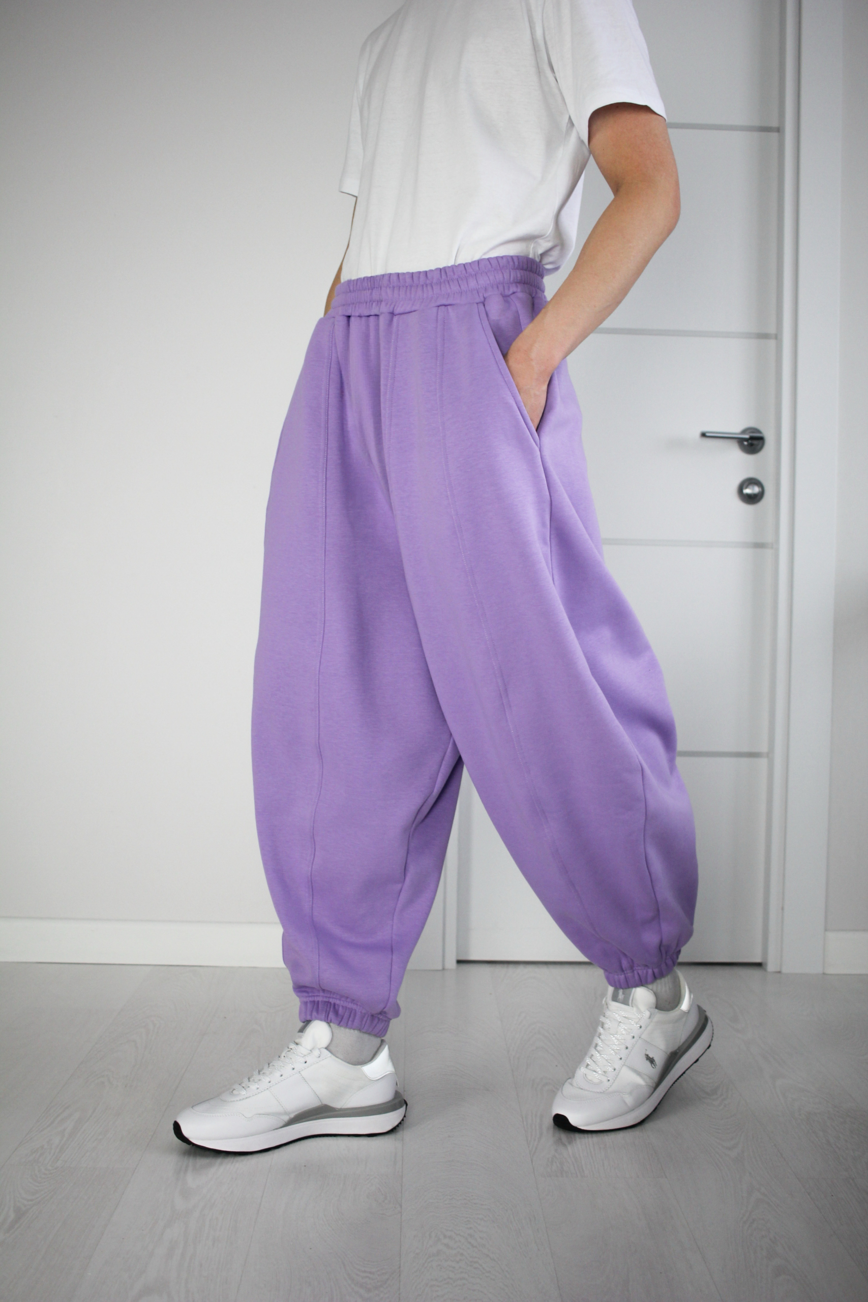 Широкие в бедрах брюки с начесом, которые свободно драпируются и сужаются книзу, собираясь на резинке.