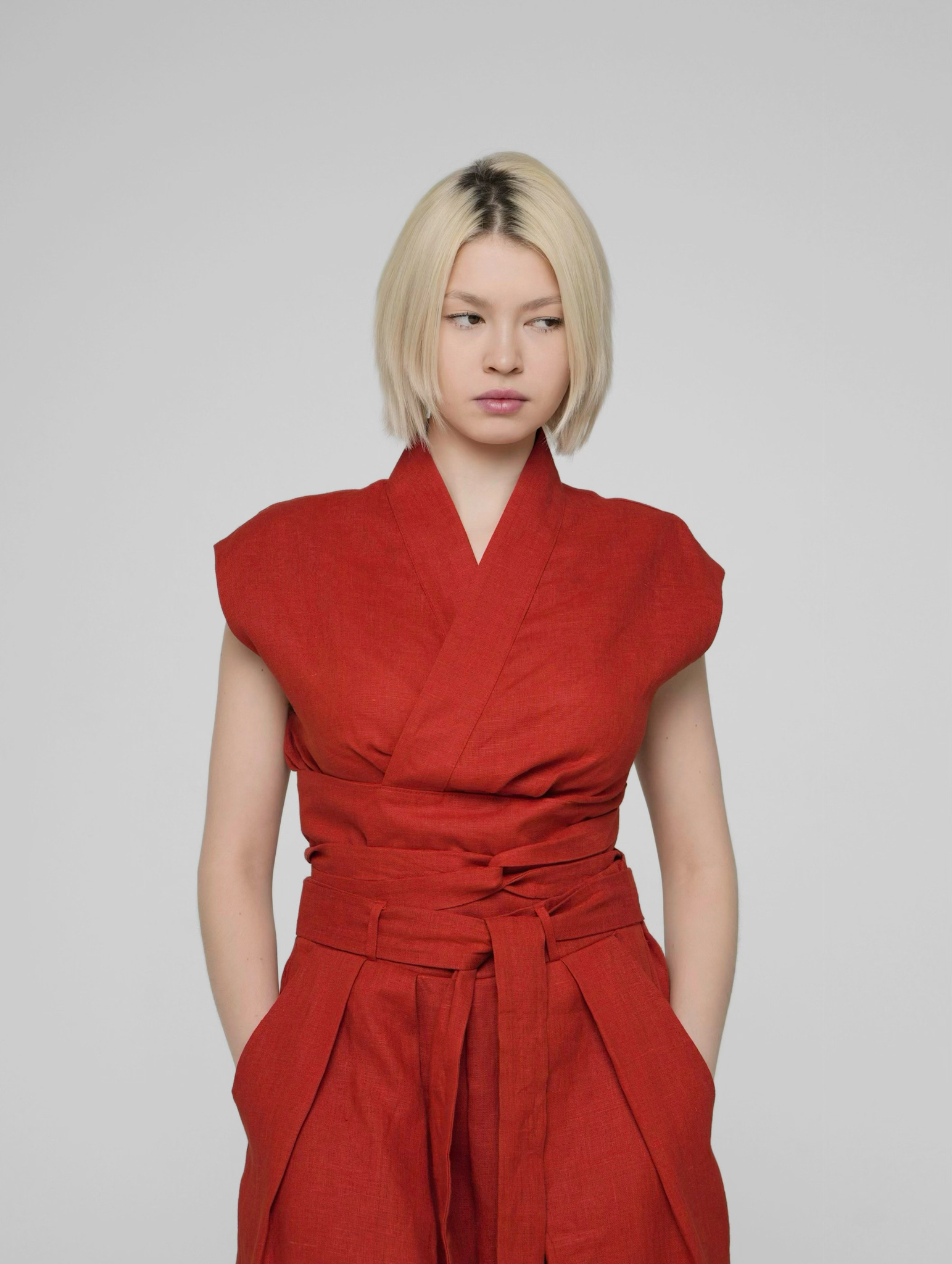 0Укороченный силуэт в сочетании с глубоким V-образным вырезом подчеркивает линию шеи и декольте. Конструкция «на запах» позволяет регулировать плотность прилегания, а вшитый пояс надежно фиксирует топ.