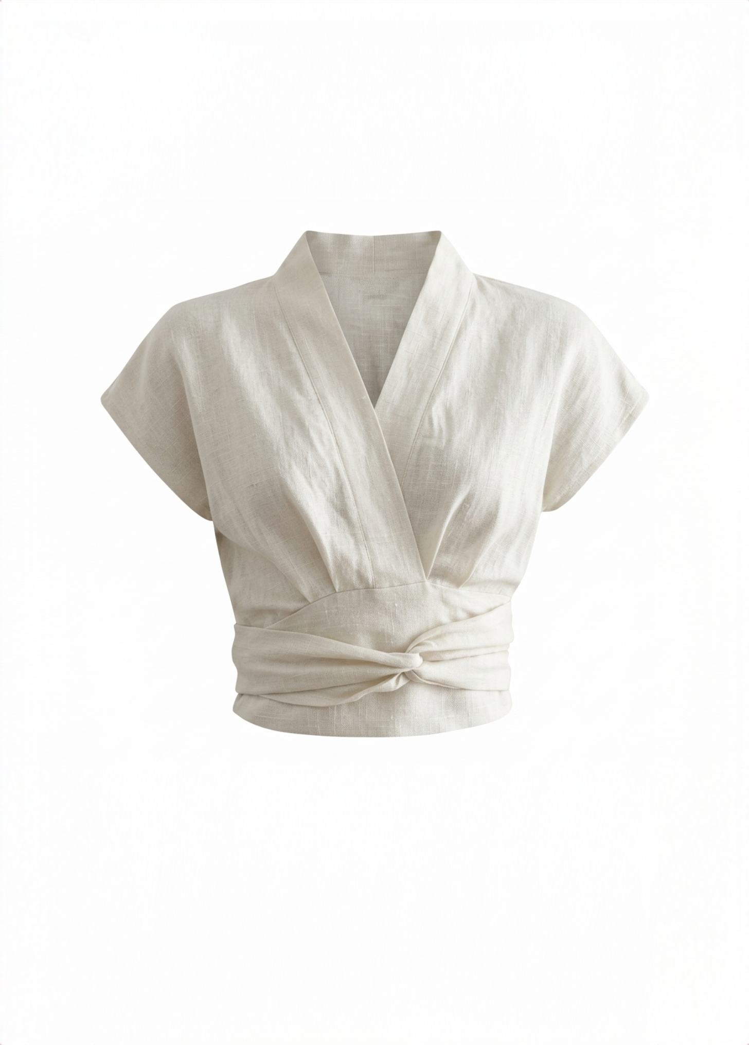 Укороченный силуэт в сочетании с глубоким V-образным вырезом подчеркивает линию шеи и декольте. Конструкция «на запах» позволяет регулировать плотность прилегания, а вшитый пояс надежно фиксирует топ.